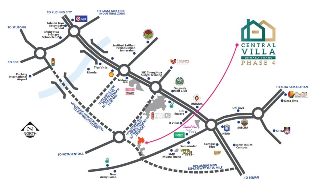 Central Villa (Phase 4) offers modern double-storey terrace homes at Bukit Berangan, Muara Tuang, strategically located along the new expressway linking Stampin (Stutong) to Bukit Berangan. This 5.2 km direct route ensures faster access to key areas and daily conveniences.